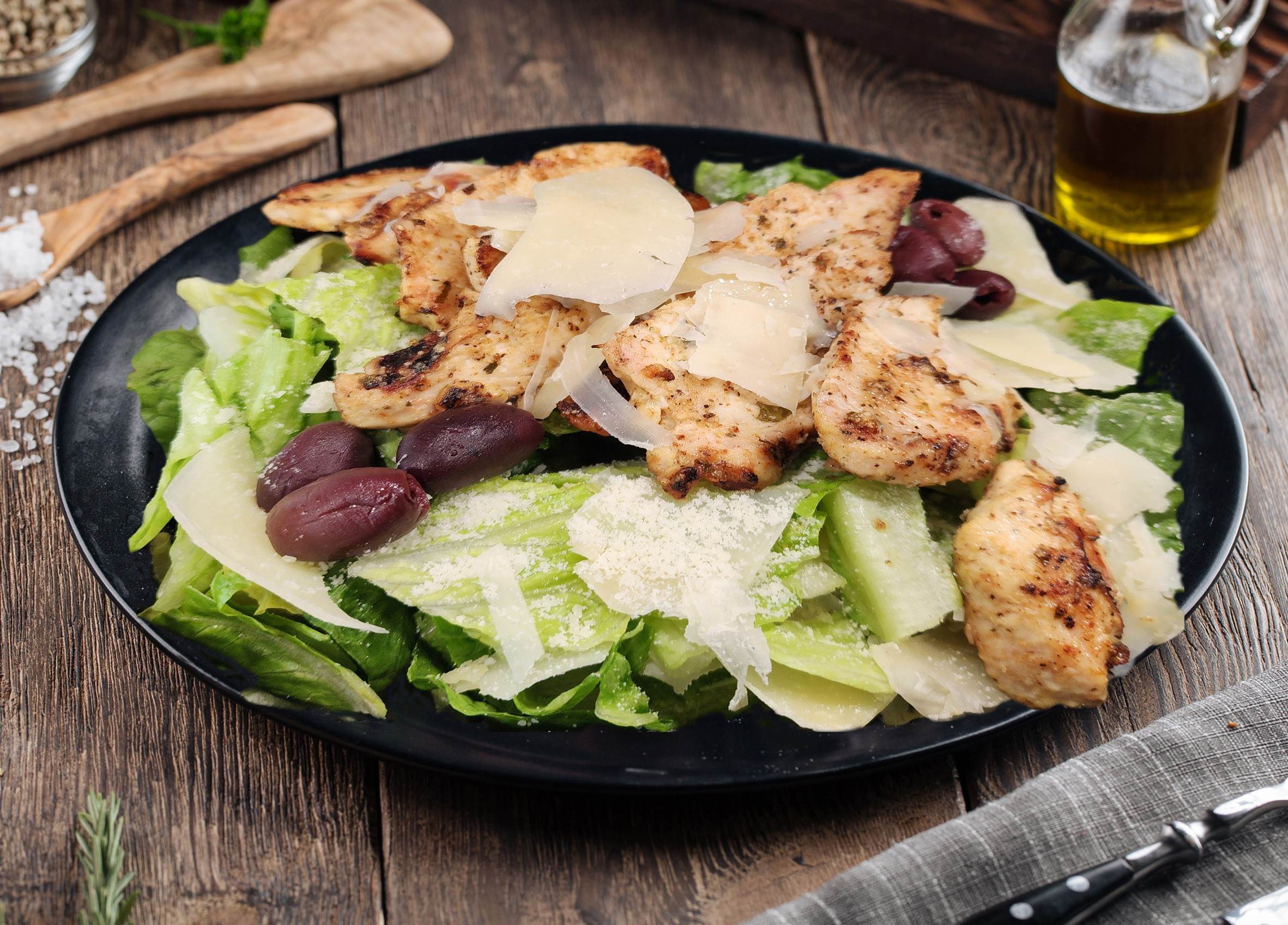 Marinated char-grilled marinated chicken breast cut into strips with lettuce, caesar dressing and parmesan cheese.