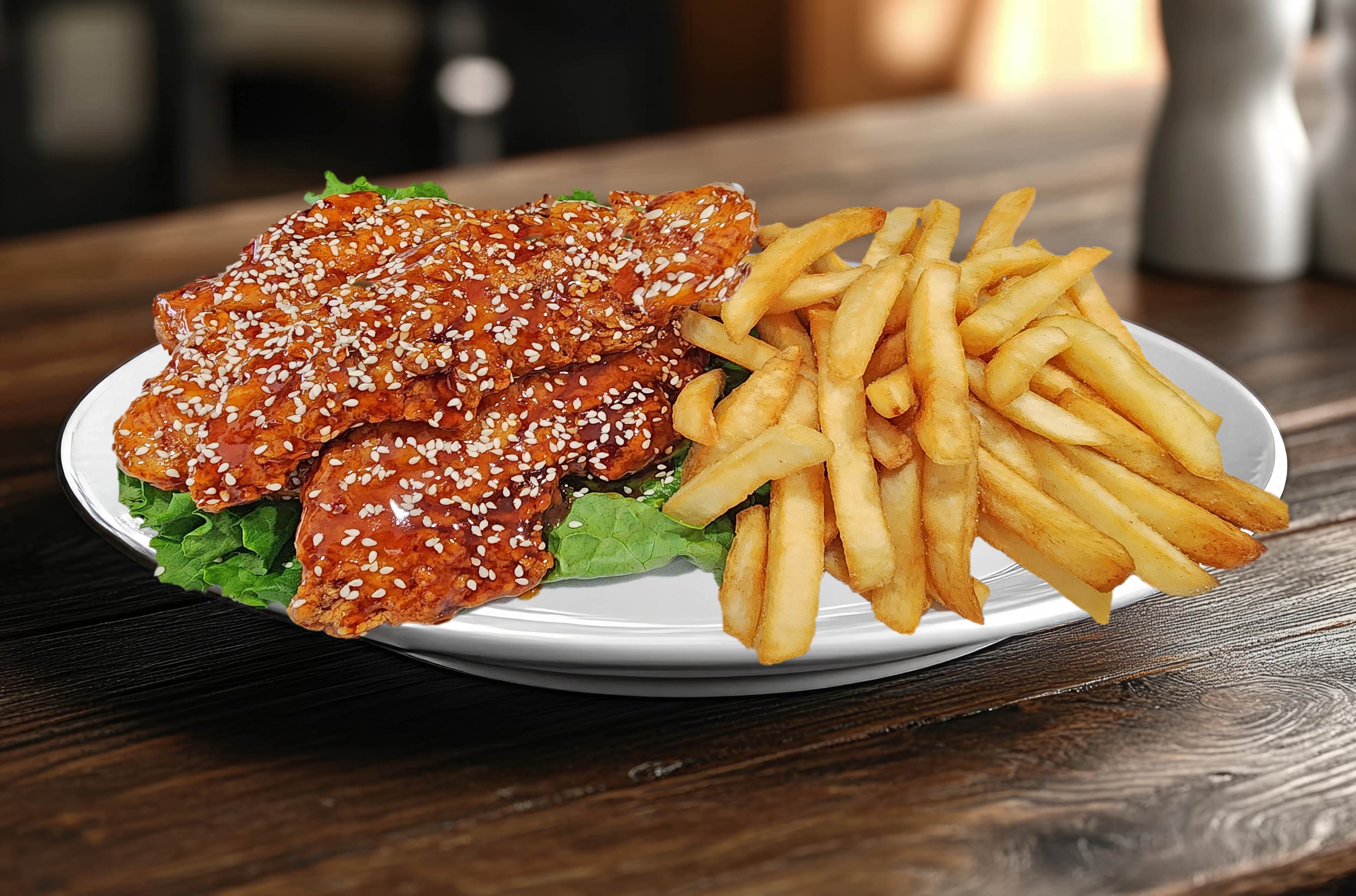 Hand breaded made to order fresh chicken tenders tossed in General Tso's sauce & sesame seeds. Served with a side of fries and your choice of dipping sauce.
